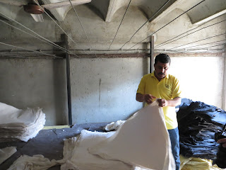 You will notice these huge bags of cloth in some of the pictures. They are making paper products here, but they are recycled from cloth of various kinds. They put the cotton cloth into large vats of water and sometimes chemicals to break it down into fibers. I visited a similar facility in Egypt where the cotton cloth was donated and the situation is similar here where this establishment is partially run with donations to help aid the group of woman who are running things. The guy in the yellow shirt is our guide but does not work there.